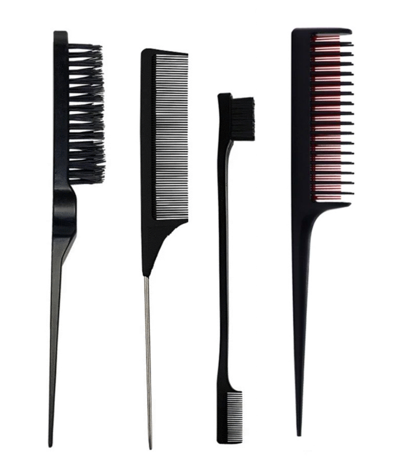 4 Piece Set for Teasing, Back Brushing, and Back Combing. It includes a Rat Tail Comb, a Brush, a Teasing Rat Tail Comb, and a Double Sided Combination Edge Control Brush/Comb. All tools can be used for blending parting sections and the hairline for Illusion crochet braids.